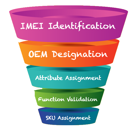 ERP determines and assigns a final part number based on device attributes collected for each respective IMEI. Each final part is tied to an ASN. Once the final part is assigned to a product, its inventory is updated. All failed/defective devices are sent off to manufacturer certified repair facility. Depending on their value, devices are either repaired with OEM certified parts at the repair facility or recycled.